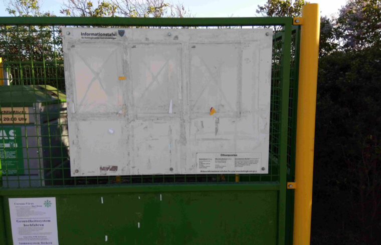 Nachdem die Informationstafeln abmoniert wurden, wurde eine Information auf den Metallwänden angebracht. Kurz darauf gab es eine Email des Amtsleiters: Ich ersuche Sie zukünftig von der Beklebung der Wertstoffinseln abzusehen, da dies nicht gestattet ist